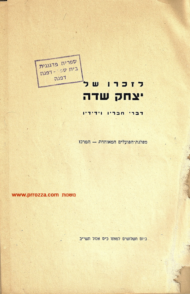 לציון יום פטירתו של יצחק שדה – 20.8.1952.