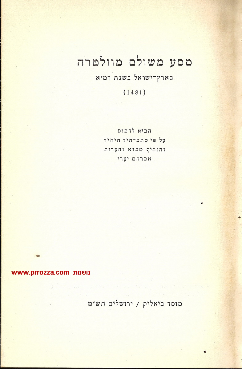 קטעים מתוך הספר: מסע משולם מוולטרה בארץ-ישראל בשנת רמ"א (1481). הביא לדפוס על פי כתב היד היחיד: אברהם יערי, הוצאת מוסד ביאליק, תש"ט (1949).