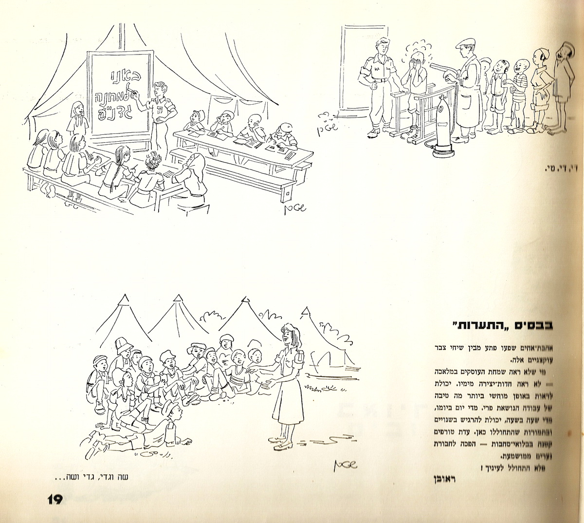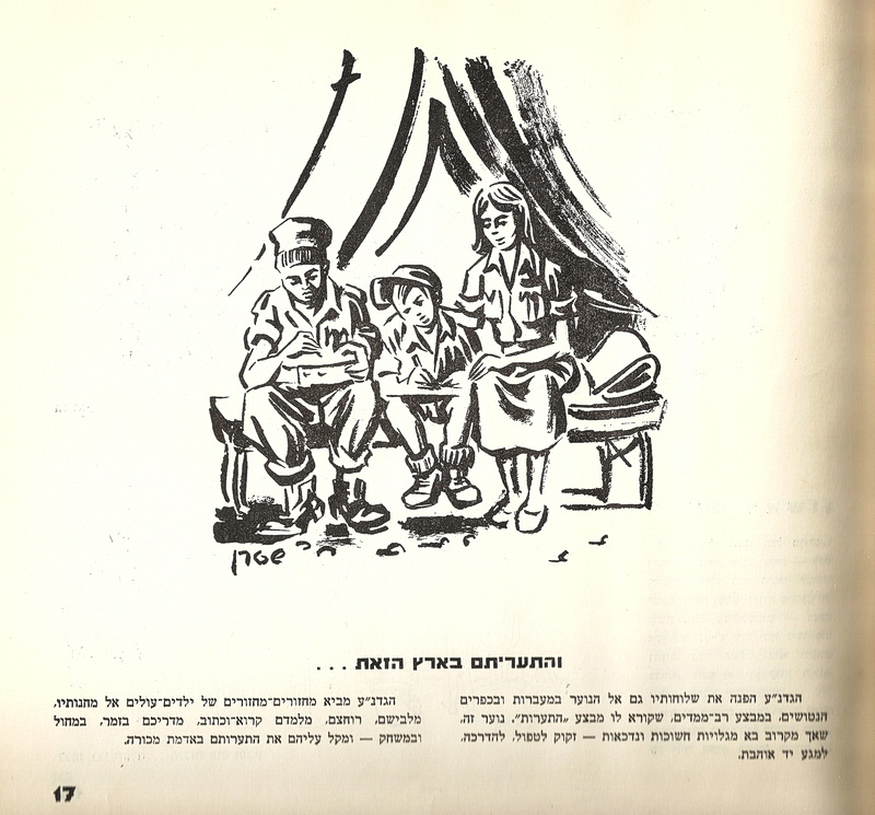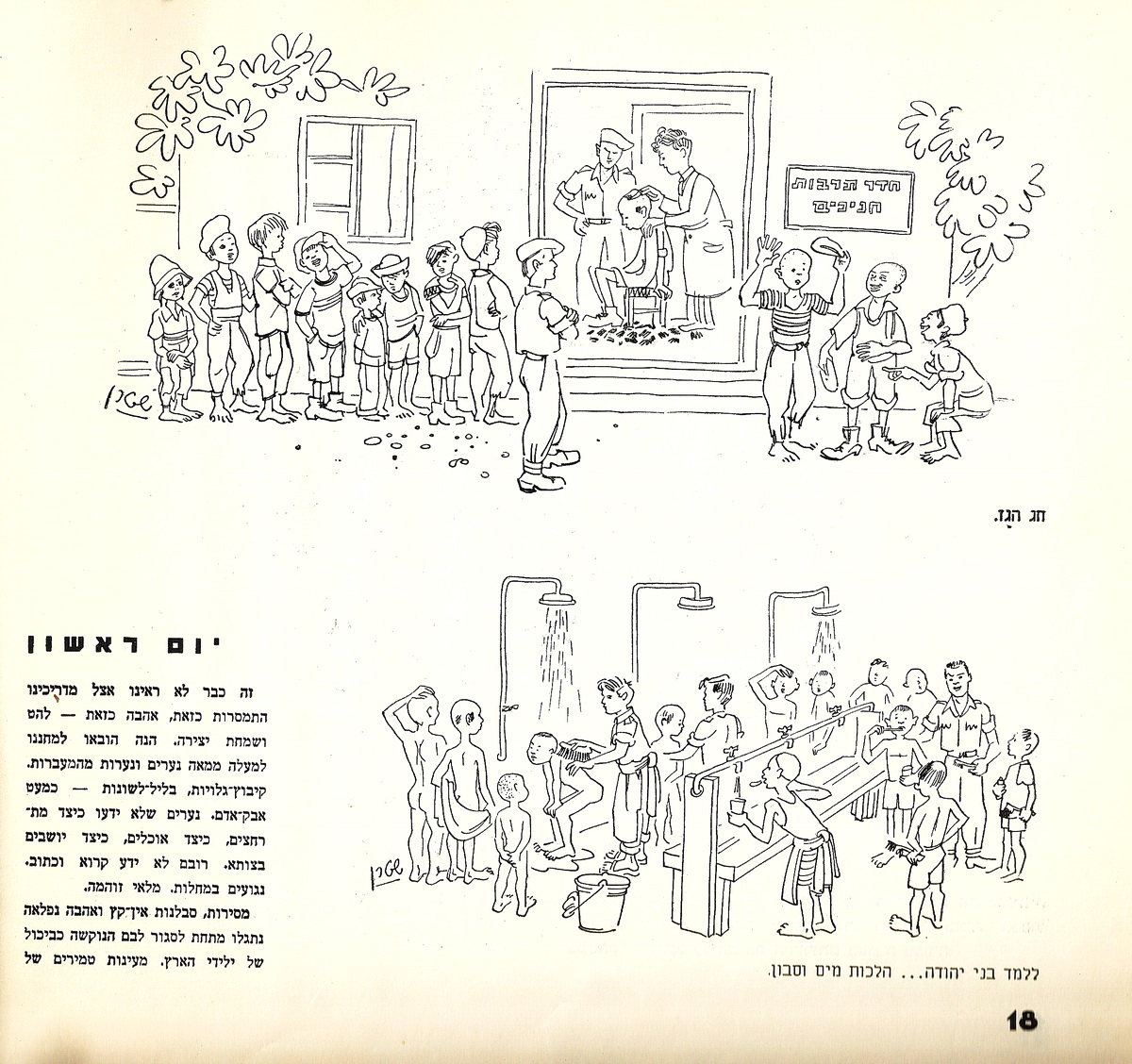 העמודים הבאים הם כפולה (המובאת כאן בשתי התמונות הבאות) ובמרכזה טקסט עליו חתום ראובן. שימו לב שהטקסט מפוצל בין שתי התמונות שלהלן, הנוסח מובא בהמשך). הציורים של יוסי שטרן מתארים ביקור של ילדי העולים במחנה הגדנ"ע. על פי המתועד באיורים החביבים – ראשית מגלחים את ראשם ("חג הגז"), אחר כך רוחצים אותם ("ללמד בני יהודה…הלכות מים וסבון"). הם עוברים ריסוס ב-די.די.טי. ורק אז הם לומדים קרוא וכתוב וגם לשיר ("שה וגדי, גדי ושה).