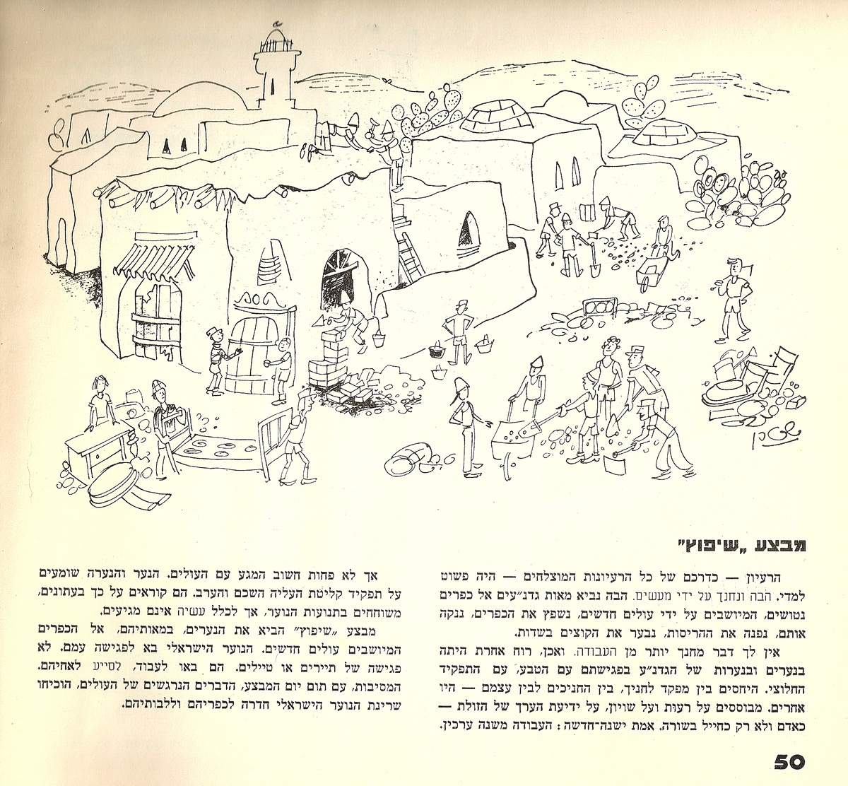 זה כבר לא ראינו אצל מדריכינו התמסרות כזאת, אהבה כזאת – להט ושמחת יצירה. הנה הובאו למחננו למעלה ממאה נערים ונערות מהמעברות. קיבוץ-גלויות, בליל-לשונות – כמעט אבק-אדם. נערים שלא ידעו כיצד מתרחצים, כיצד אוכלים, כיצד יושבים בצותא. רובם לא ידע קרוא וכתוב. נגועים במחלות. מלאי זוהמה.