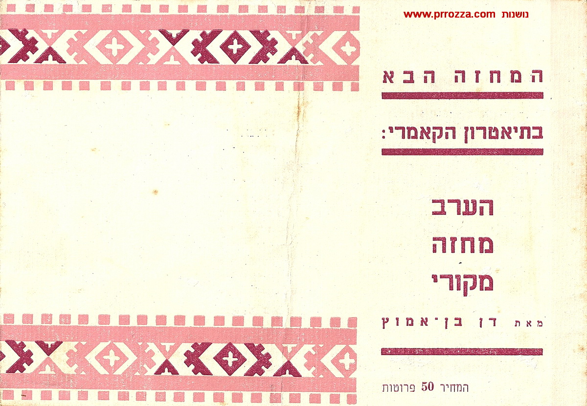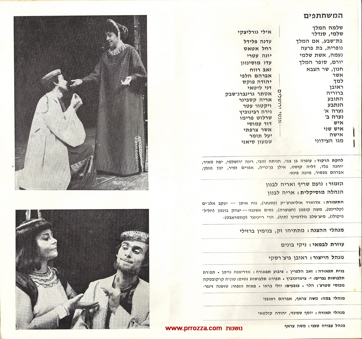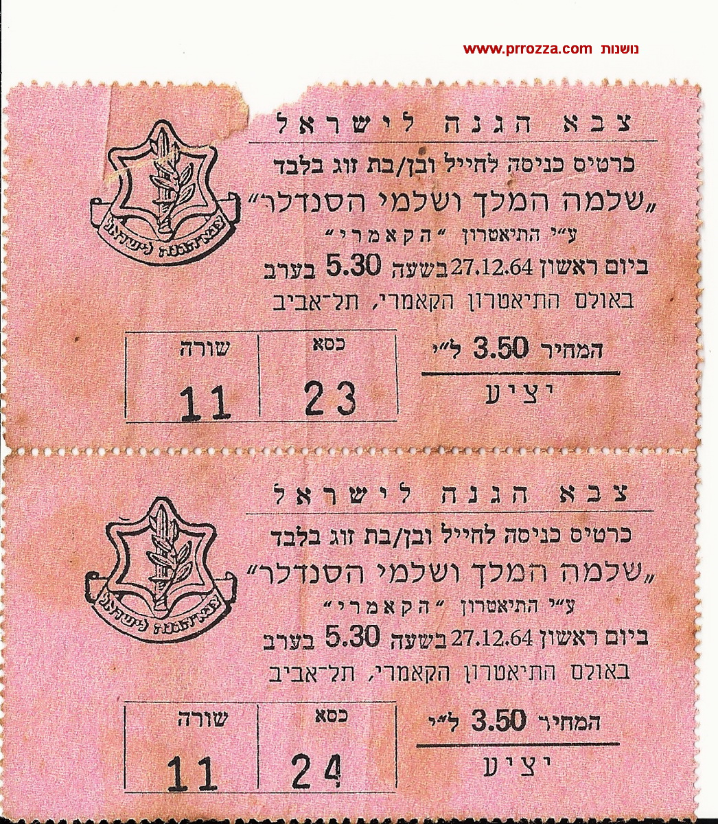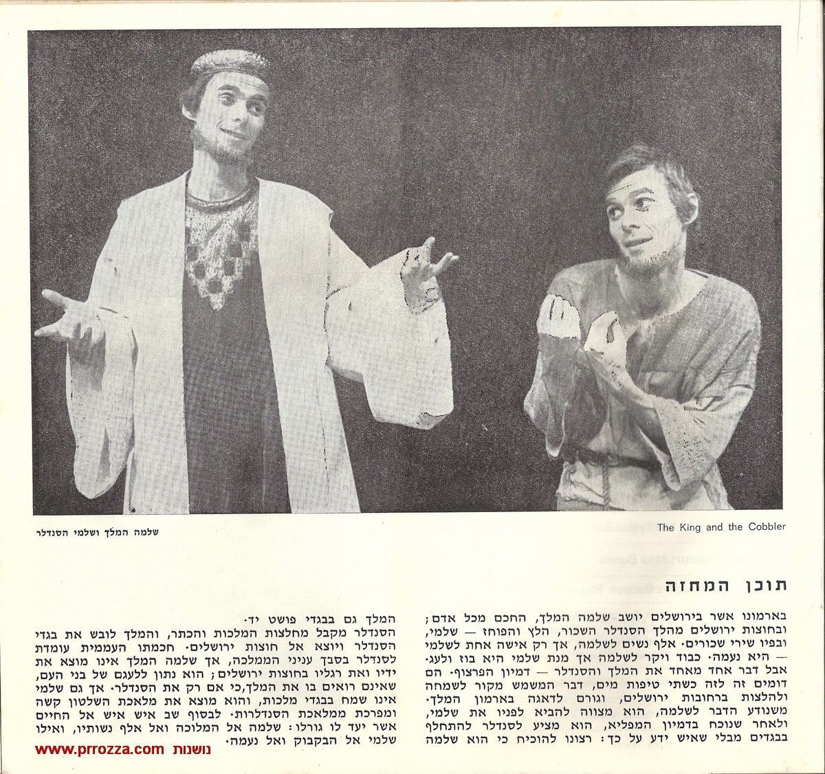 ז. ולסיום פרק זה המוקדש לתיאטרון הישראלי, נחזור אל התיאטרון הקאמרי ולמחזמר "שלמה המלך ושלמי הסנדלר" במהדורת מחזמר, משנת 1964 (כפי שמעידים הכרטיסים המצורפים להלן). זהו אחד ממופעי הבמה המצליחים של כל הזמנים בישראל והתכנייה בהתאם. כריכה צבעונית, ארבעה-עשר עמודים מוקדשים לפרסומות! בצבע ספיה חגיגי (ראו דוגמה להלן). ראו מידע מעניין על כותב המחזה, דמות ססגונית כשלעצמה.
