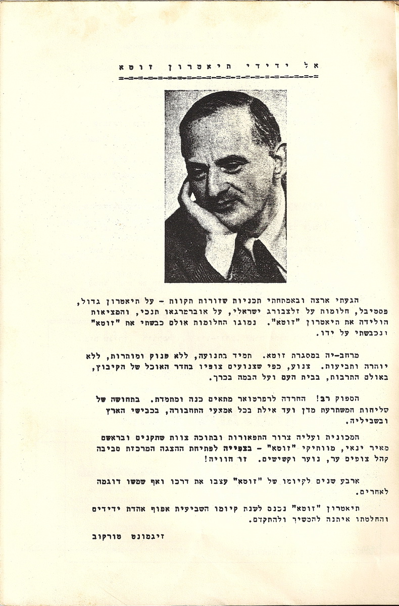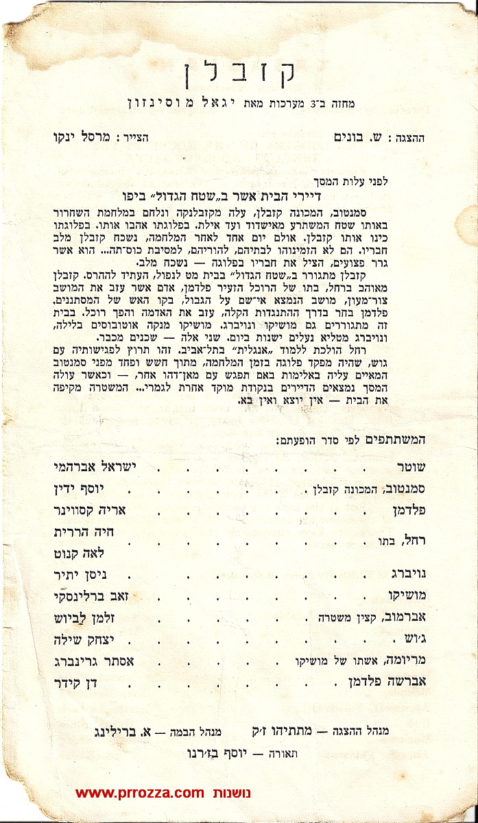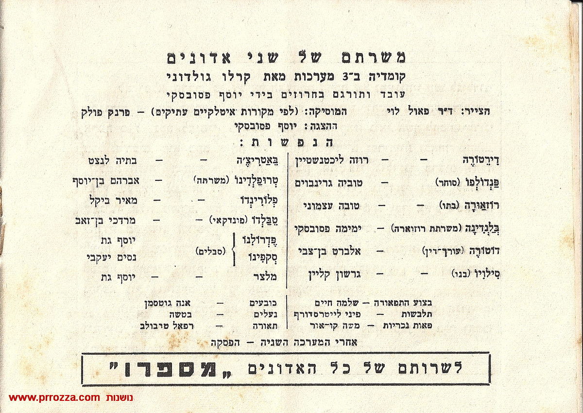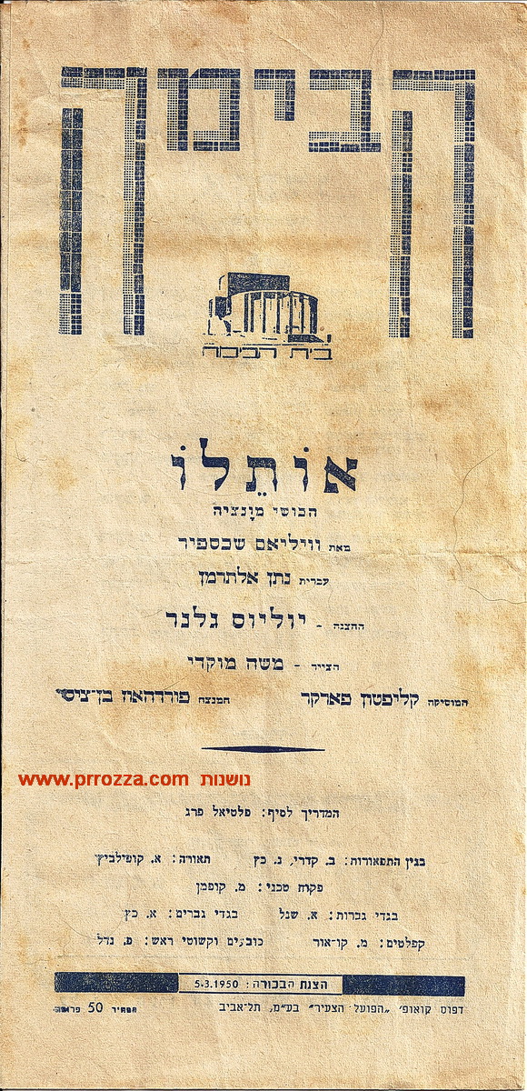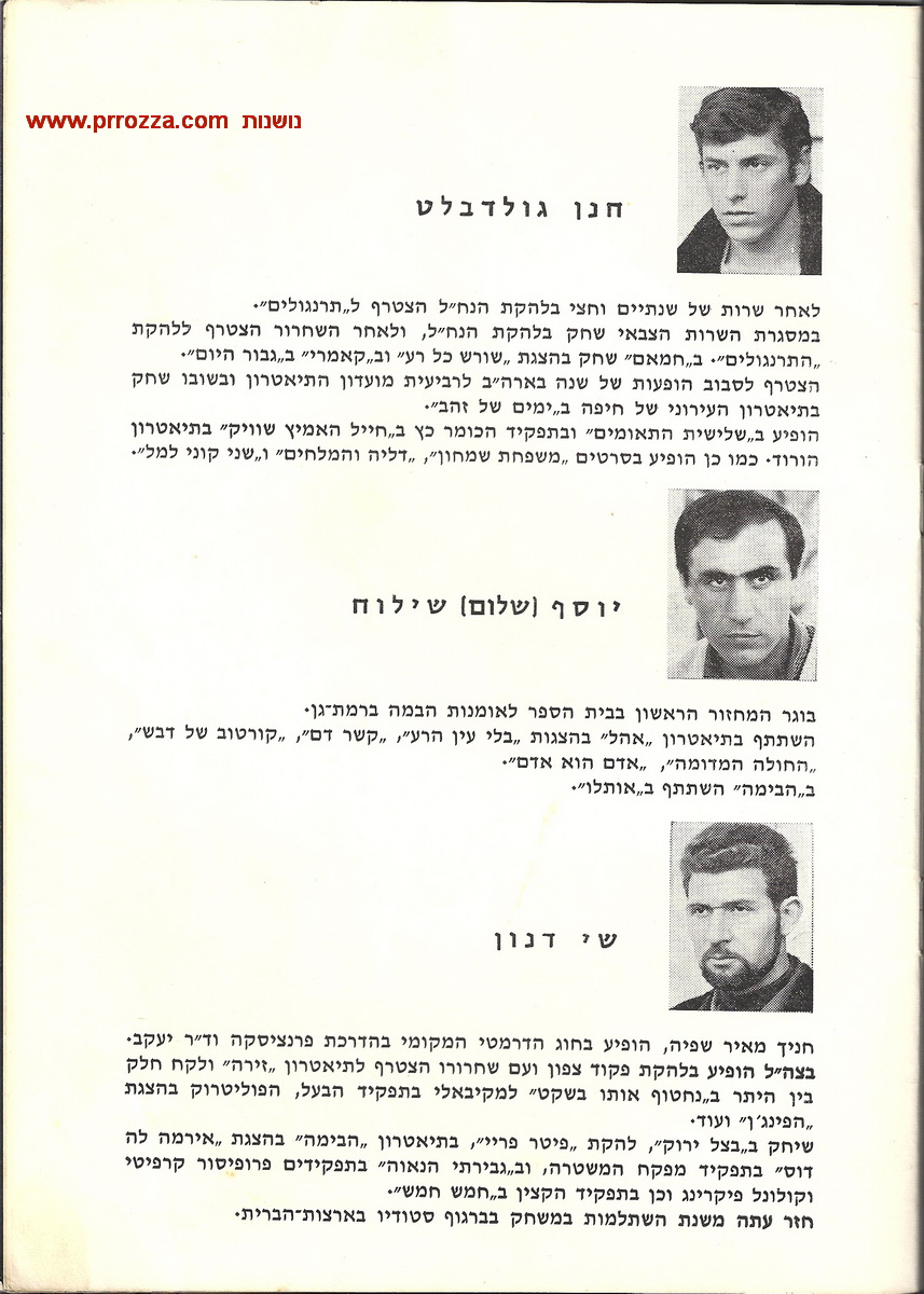ז. ולסיום פרק זה המוקדש לתיאטרון הישראלי, נחזור אל התיאטרון הקאמרי ולמחזמר "שלמה המלך ושלמי הסנדלר" במהדורת מחזמר, משנת 1964 (כפי שמעידים הכרטיסים המצורפים להלן). זהו אחד ממופעי הבמה המצליחים של כל הזמנים בישראל והתכנייה בהתאם. כריכה צבעונית, ארבעה-עשר עמודים מוקדשים לפרסומות! בצבע ספיה חגיגי (ראו דוגמה להלן). ראו מידע מעניין על כותב המחזה, דמות ססגונית כשלעצמה.