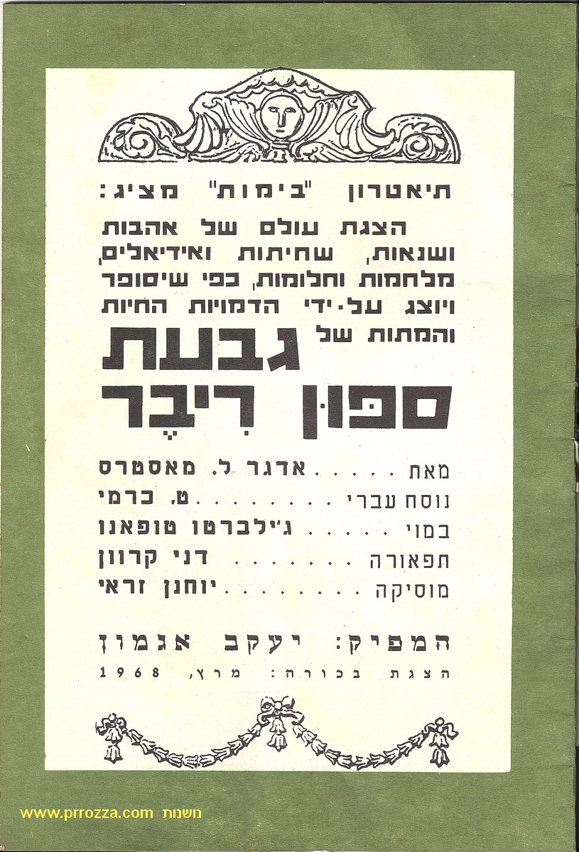 ה. תיאטרון בימות נוסד ונוהל על ידי יעקב אגמון ופעל בין השנים 1956 – 1967. כוכביו היו גילה אלמגור, אבנר חיזקיהו ויוסי בנאי (בנאי ואלמגור זכורים לטוב מן ההצגה הכלה וצייד הפרפרים). מתוך התכנייה של ההצגה "גבעת ספון ריבר" משנת 1968. שימו לב לצוות השחקנים, שכיכב באותה שנה בלהיט "איש חסיד היה". ראוי לציון גם האחראי על התפאורה, דני קרוון, שעלה אחר כך לגדולה.