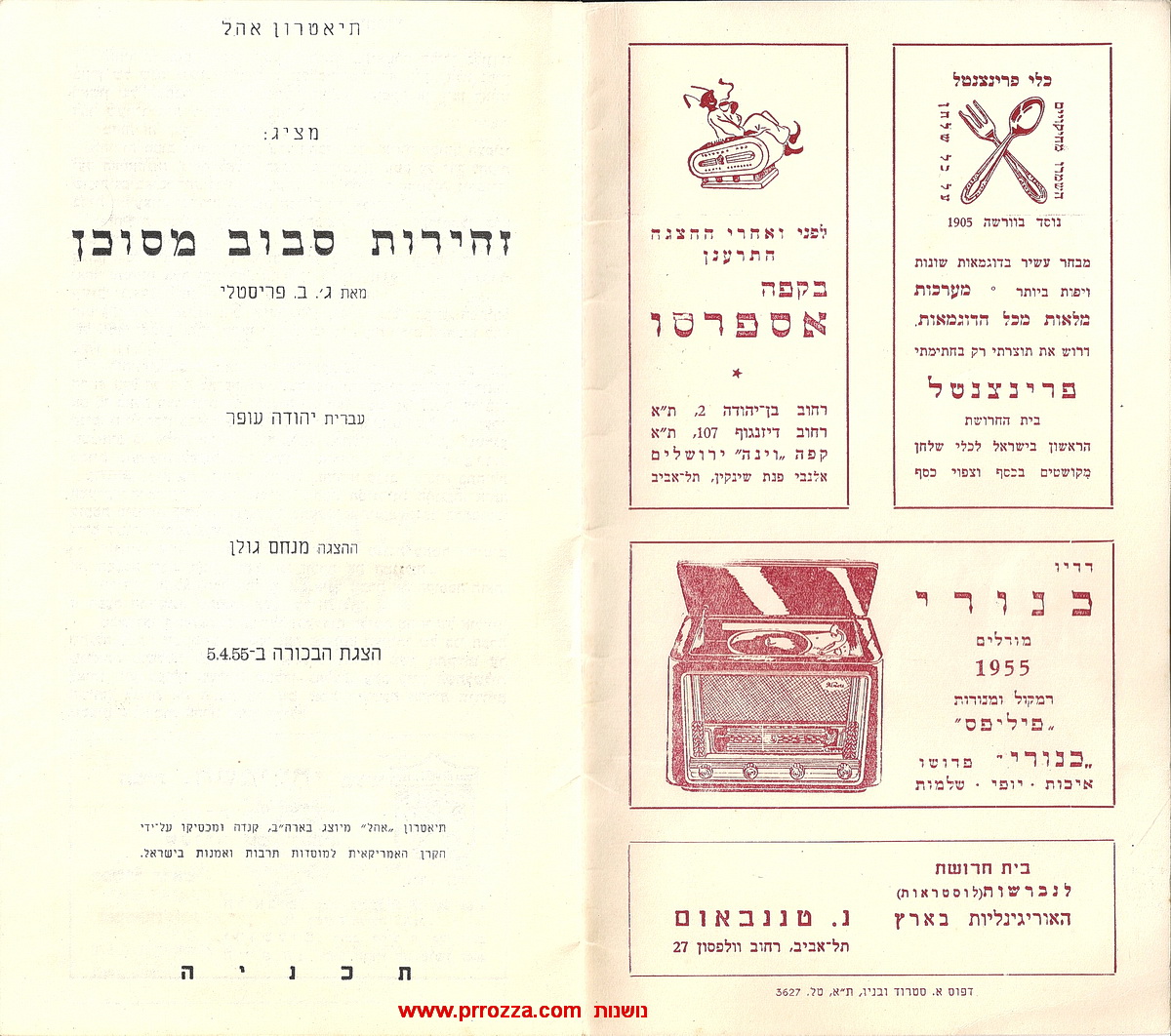 ג. תיאטרון אהל, פעל בחסות הסתדרות העובדים הכללית של העובדים העבריים בארץ ישראל, בין השנים 1925 – 1969. בשמו המלא: "אהל, תיאטרון פועלי ישראל". מתוך תכניית ההצגה "זהירות סבוב מסוכן" משנת 1955, בבימויו של מנחם גולן: